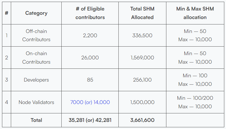 যতটা সম্ভব অবদানকারীকে চিনতে আমাদের প্রচেষ্টা সত্ত্বেও, আমাদের ফেজ ১ এয়ারড্রপের সমস্ত নোড যাচাইকারী এবং অন্যান্য অবদানকারীদের জন্য SHM পুরস্কার প্রসারিত করা সম্ভব নয়। যাইহোক, আমরা আপনাকে আমাদের আর্লি কন্ট্রিবিউটর প্রোগ্রাম (ইসিপি) প্ল্যান উপস্থাপন করতে পেরে উত্তেজিত বোধ করছি যারা ফেজ ১ এর যোগ্যতা সময়কালে ন্যূনতম যোগ্যতার মানদণ্ড পূরণ করেছে। উদাহরণস্বরূপ, >৫০ স্ট্যান্ডবাই নোড ঘন্টার জন্য একটি নোড পরিচালনা করা, শীর্ষ ৫০টি শার্দিয়াম লীগ ইত্যাদি। (সঠিক মানদণ্ড কাট-অফ তারিখের পরে প্রকাশ করা হবে)।
